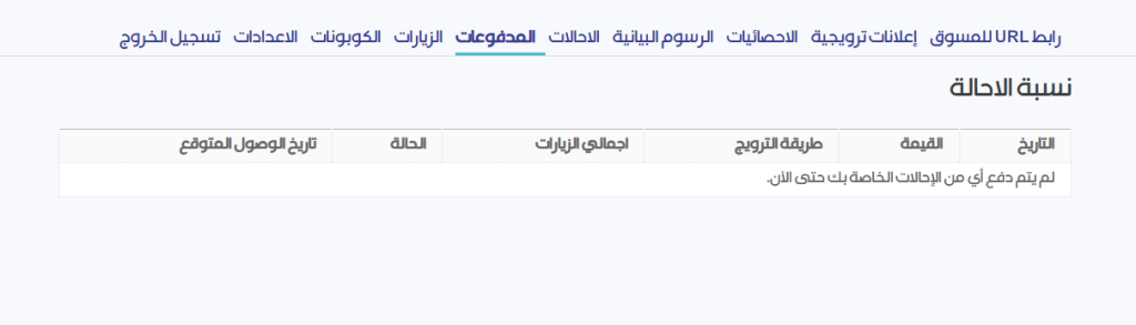 هذا القسم يعرض تفاصيل العمولات التي حصلت عليها من الإحالات عبر رابطك أو الكوبون، ويوضح حالتها سواء تم دفعها أو لا.