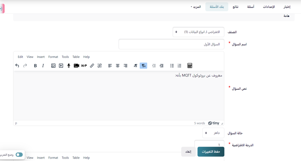 عامة: تمكنك من إضافة اسم السؤال |نص السؤال | الدرجة الإفتراضية |الجواب الصحيح.
