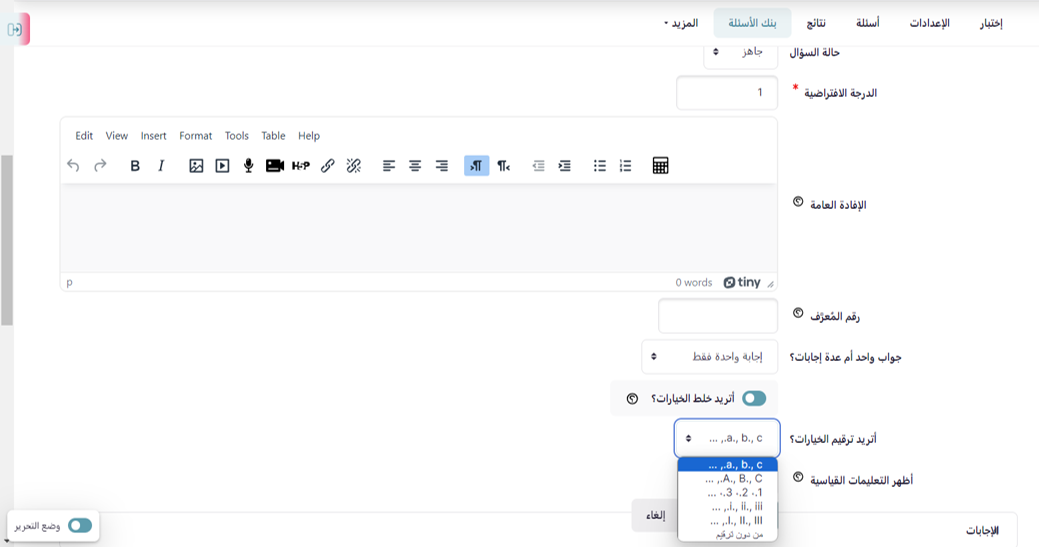 وايضاً يمكنك أختيار خلط الاجابات|وشكل ترقيم الاجابات الذي ترغب به.