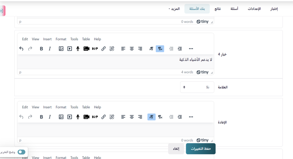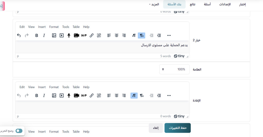 وكذلك أختيار ما إذا كنت ترغب بجعل الإجابة الصحيحة واحدة أو عدة إجابات